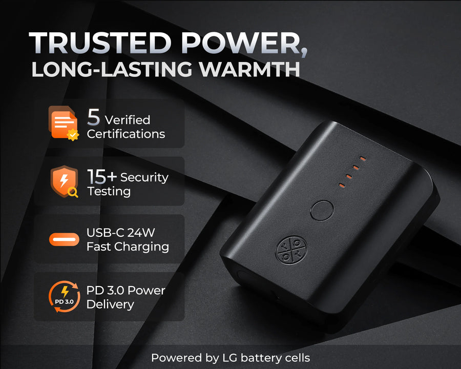 - 5 heating zones (left & right pockets, mid-back, and left & right arms)